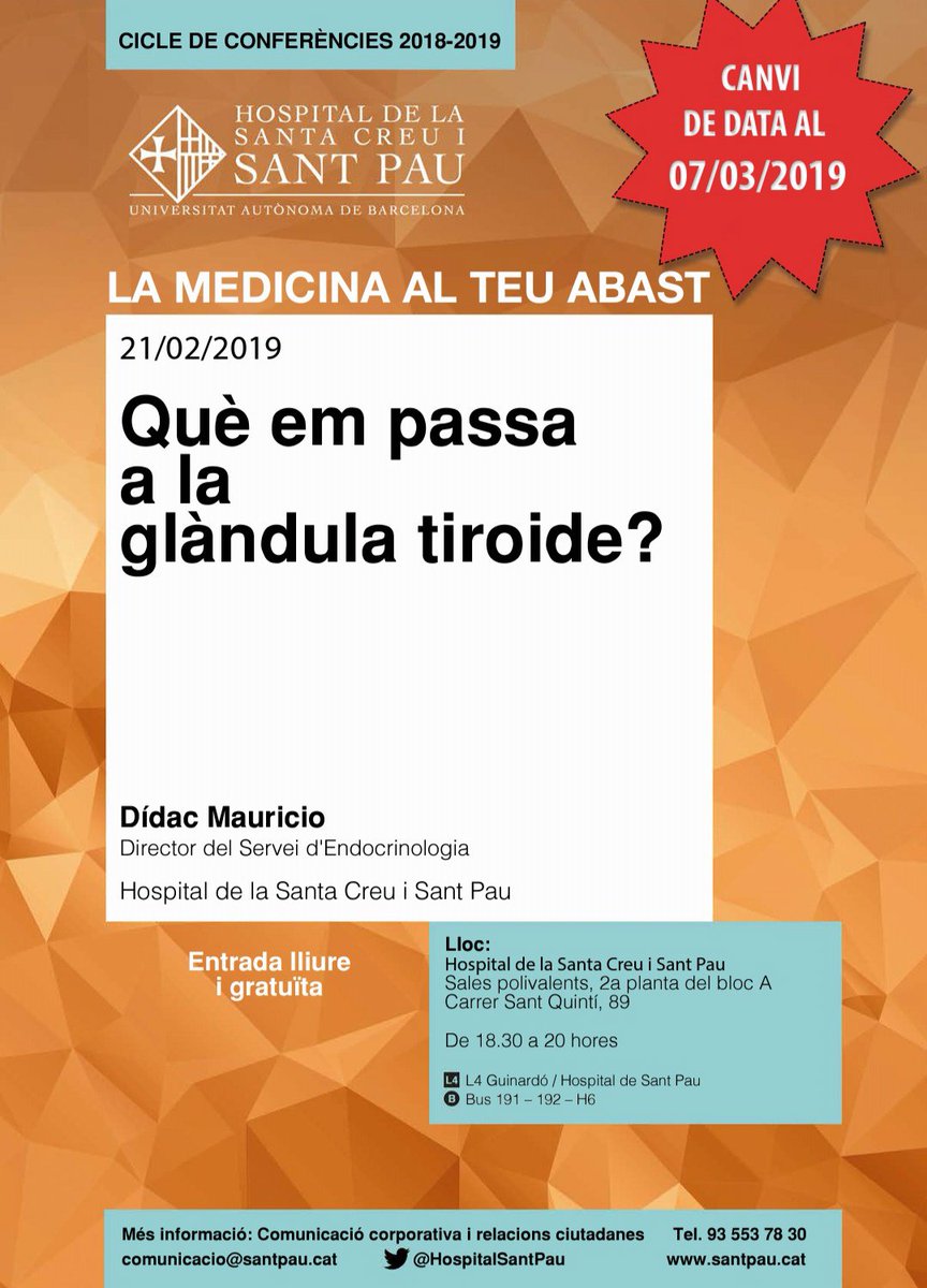 - La sessió “Què em passa a la glàndula tiroide?” prevista per dijous 21/02 canvia al dijous 07/03. La conferència serà a càrrec del Dr. Dídac Mauricio, director d' @EndocrinoSPau, i tindrà lloc a les sales polivalents de l'hospital de 18.30 a 20 h. L’entrada és lliure i gratuïta.